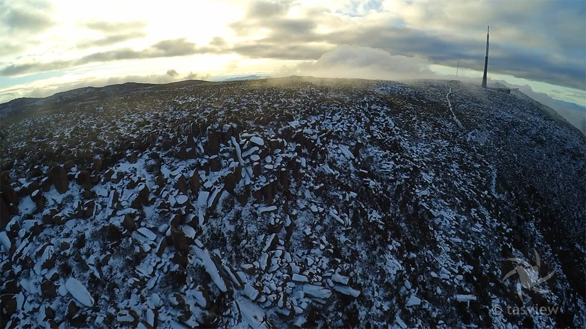 After checking the road to the top was open and great wind conditions, I braved the cold and headed up Hobart’s mountain backdrop to play with my F550 in the snow! I walked about 30 minutes south of the carpark and giant radio/tv tower to the boulder fields. The sky’s were clear on takeoff, but 12 minutes later the cloud came in and I hastily landed to retrace my steps in the mist with reduced visibility on a poorly marked track.