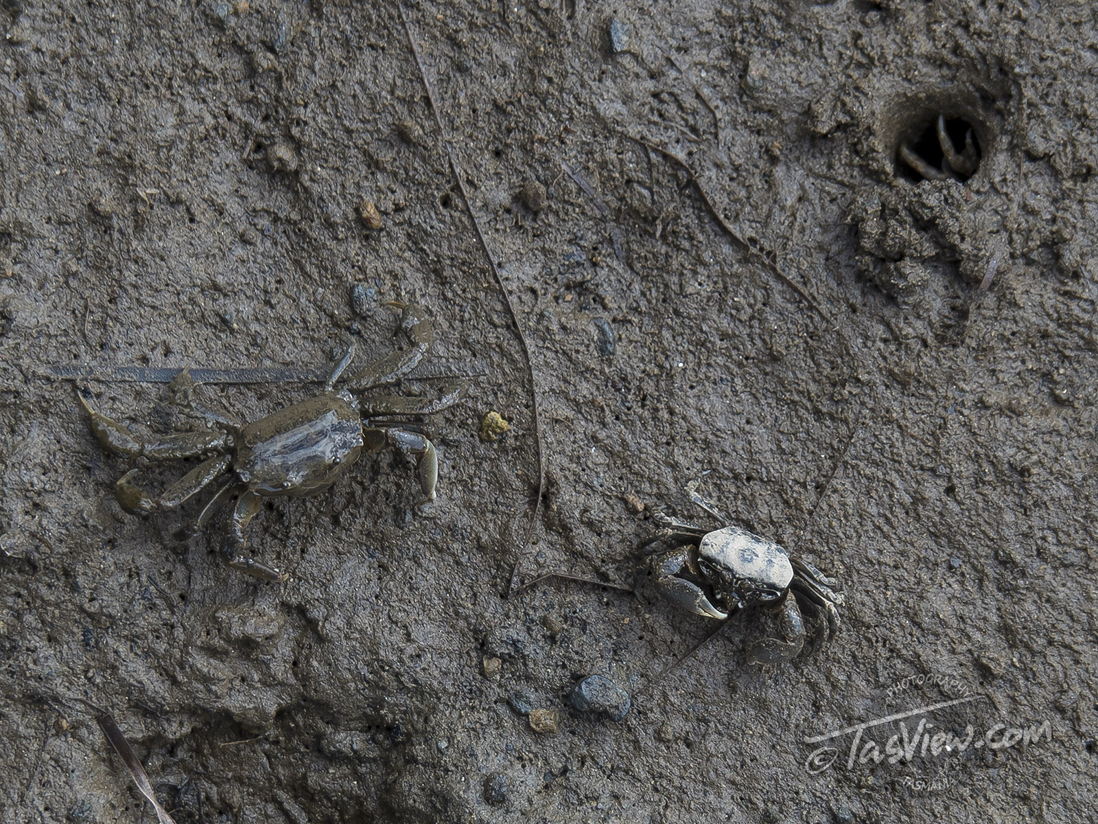 The tide was quite low on one of the few remaining muddy estuaries where several small creeks run out to the River Derwent from the foothills of kunanyi / Mt Wellington. There were plenty of crabs scurrying about. They would hide in their holes as we approached overhead, but venture out again to feed if you waited and stood still enough.