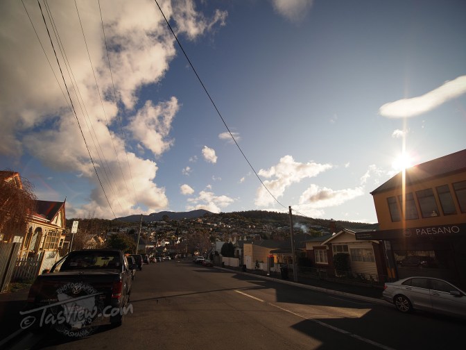 Street scene uncropped showing distortion at edges and lens flare at left.