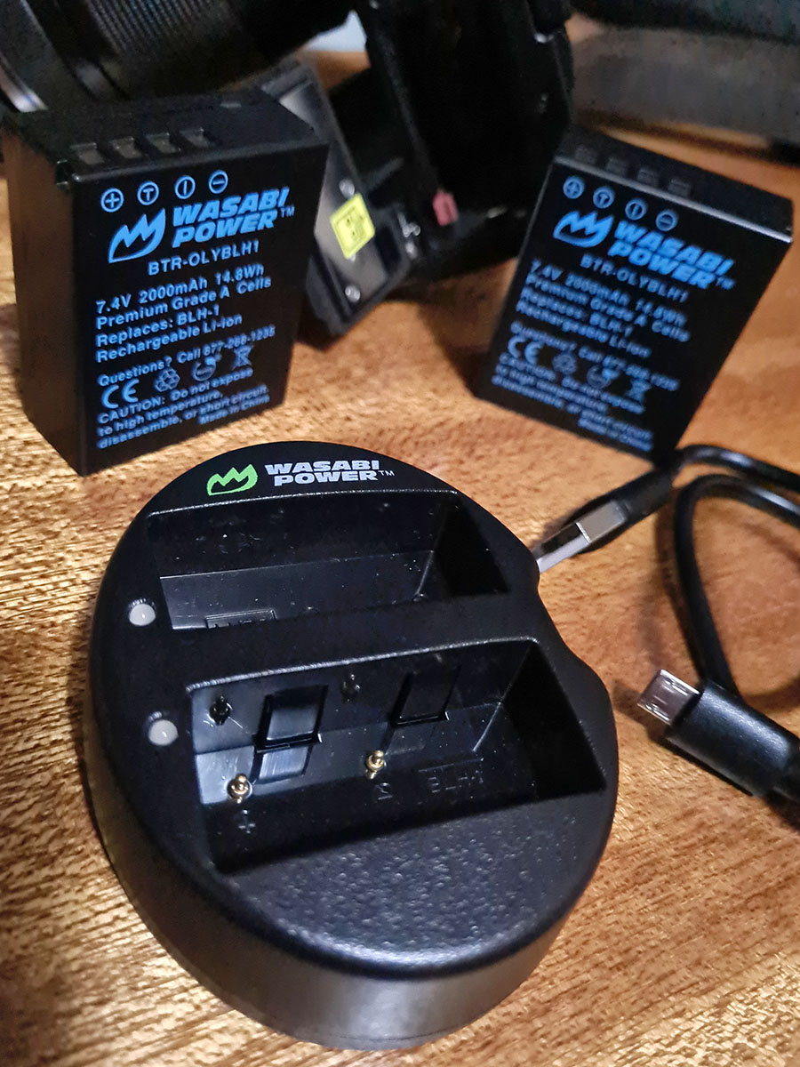 I also bought some after market Wasabi Power batteries (ebay) with a convenient dual USB powered charger – so I can recharge from a USB power-bank anywhere! I paid extra for these higher powered 2000mAh fully decoded batteries, they work perfectly (at least 10 charges now) – with battery % reading in camera unlike the non-decoded version that show a non-genuine warning. I put some strong tape on the batteries to make a tab, so if they ever swell, there’s something to pull on.