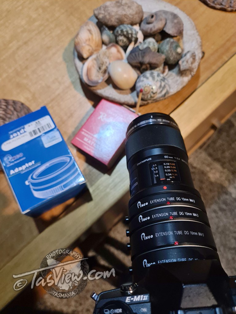 I ordered two sets of Pixco extension tubes, they are around $35AU per set which consists of 10mm and 16mm tubes. These contain no glass or lens but do have contacts so the attached lens works normally with auto focus and aperture control.