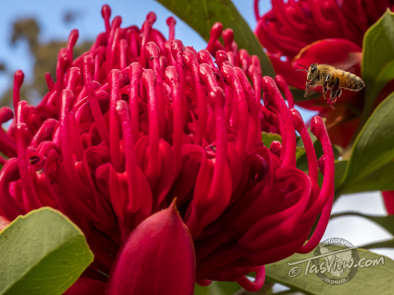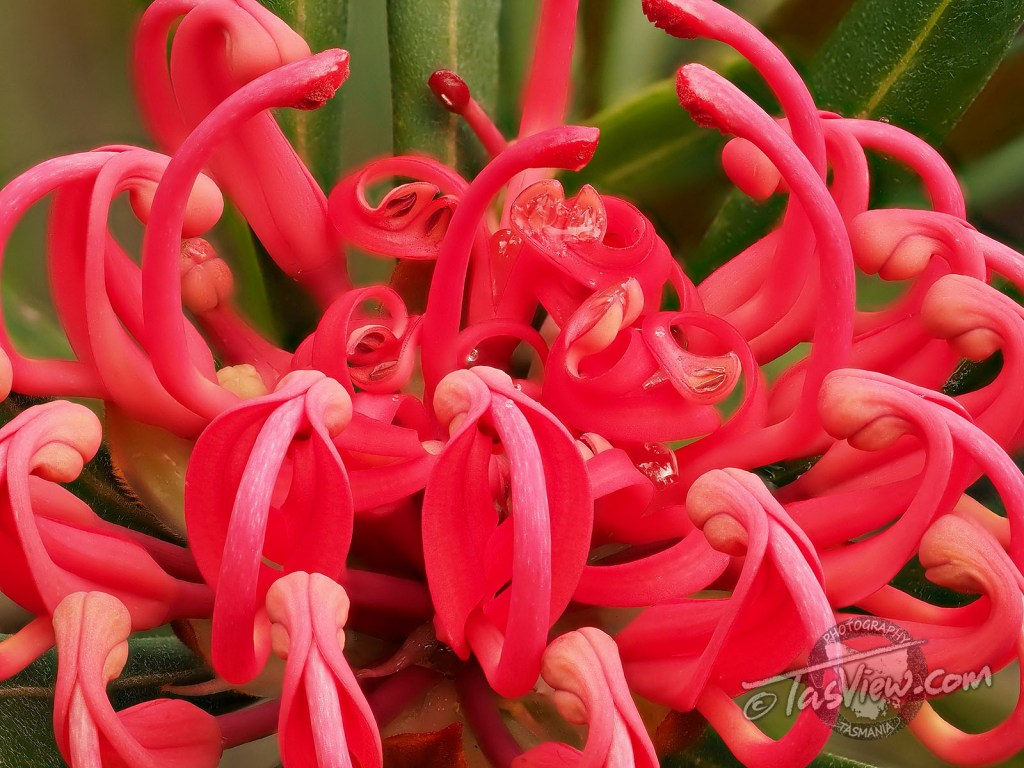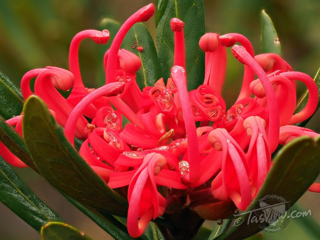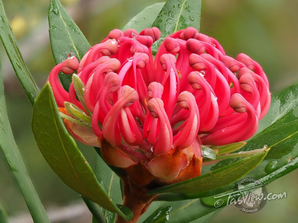Telopea truncata, commonly known as the Tasmanian waratah, is a plant in the family Proteaceae. It is endemic to Tasmania where it is found on moist acidic soils at altitudes of 600 to 1200 m (2000–4000 ft). These flowers were located above “The Springs” on the Organ Pipe track, kunanyi – Mt Wellengton.