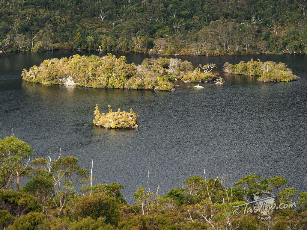 The sun peaks through small breaks in the cloud, highlighting “Honeymoon Islands” at the far end of Dove Lake.