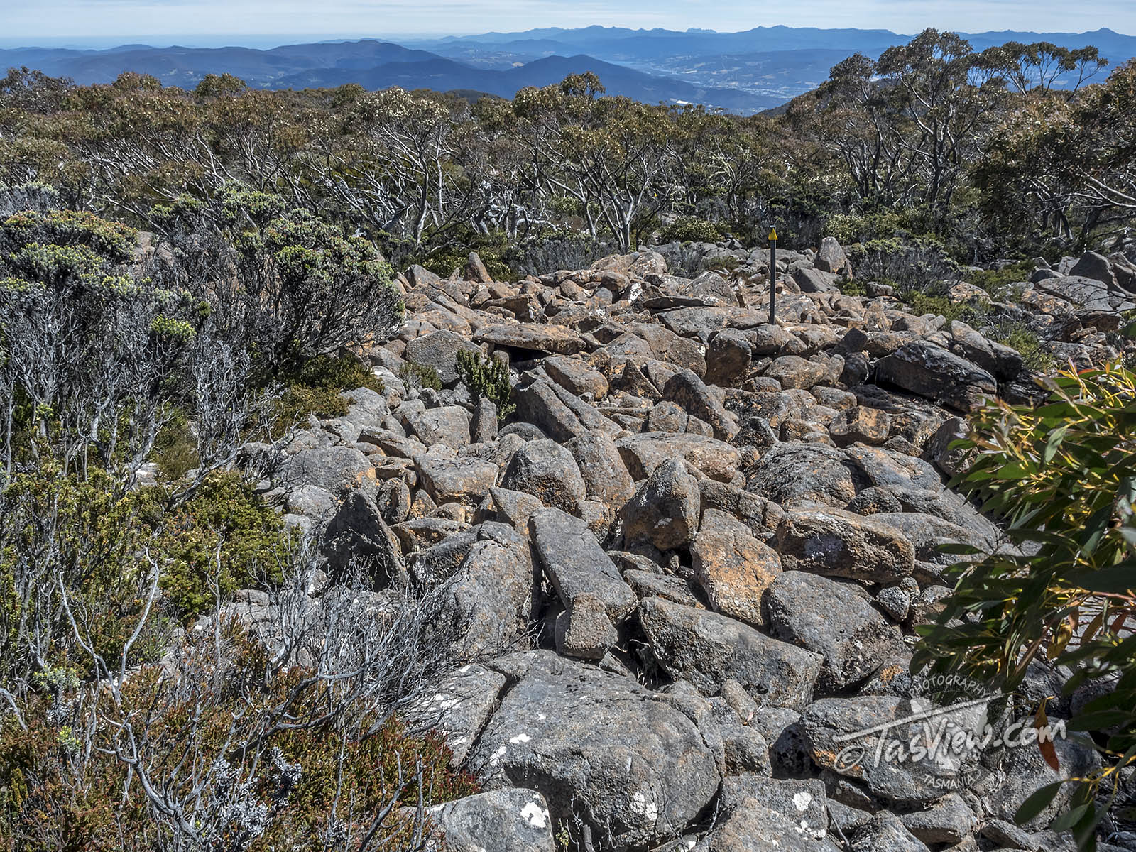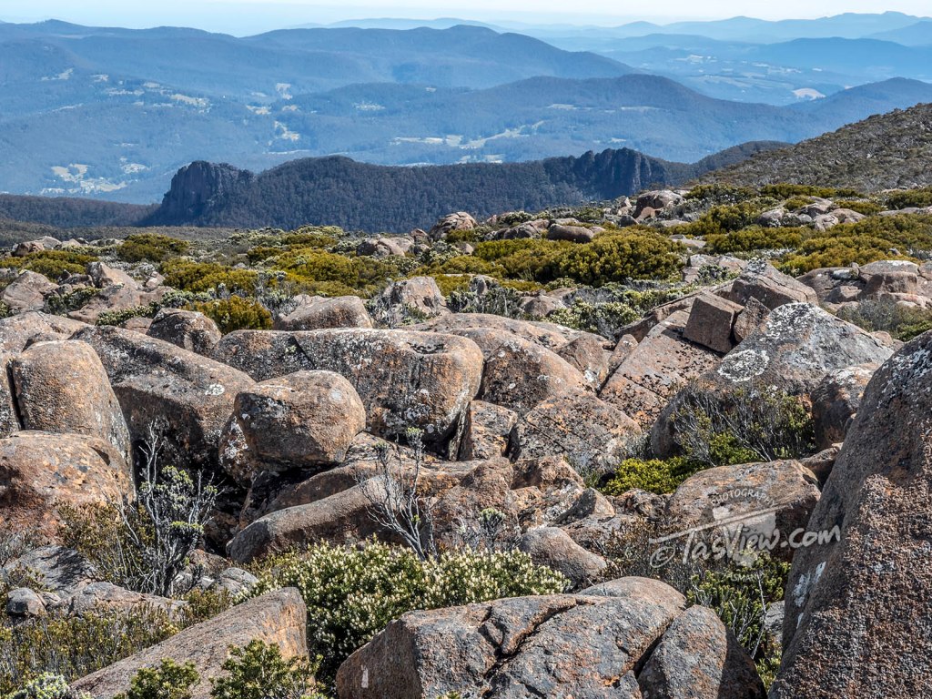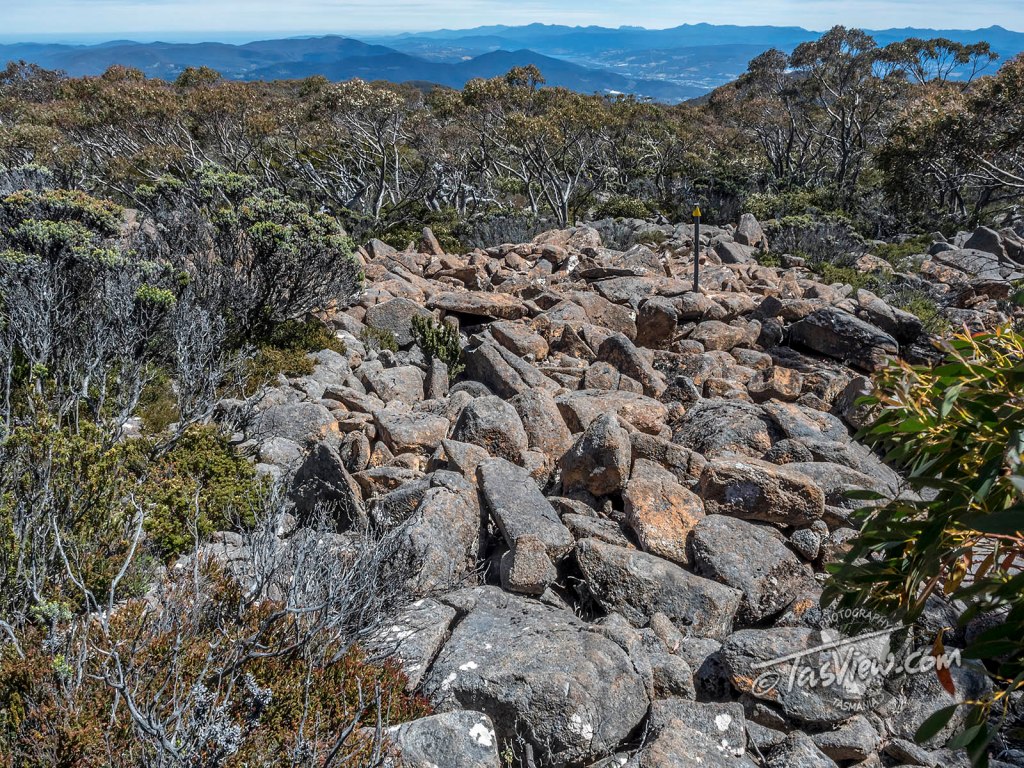 I think this track was built by a mad person. It weaves about like a drunkard, taking you into the most inhospitable rock-hopping, ankle twisting terrain you could imagine, all the while, seemingly averting your eyes from any chance of catching what could be a breath-taking view. I was so tempted to scramble up onto the boulders at the top of the ridge below (there is no track up there), but thought better of it with my recovering knee.