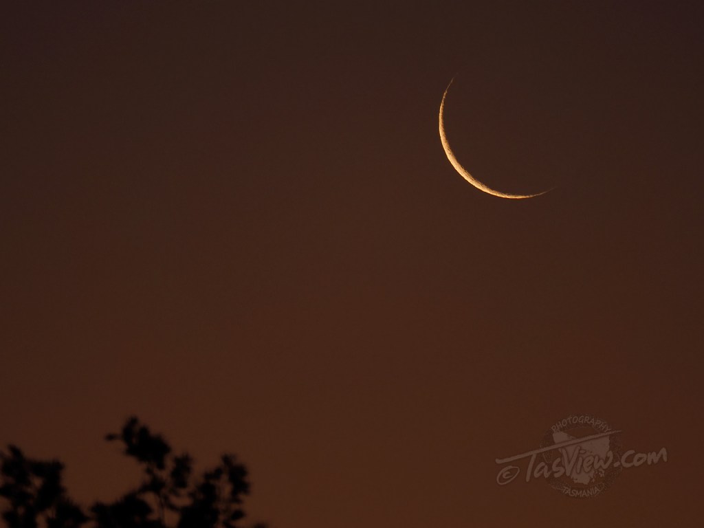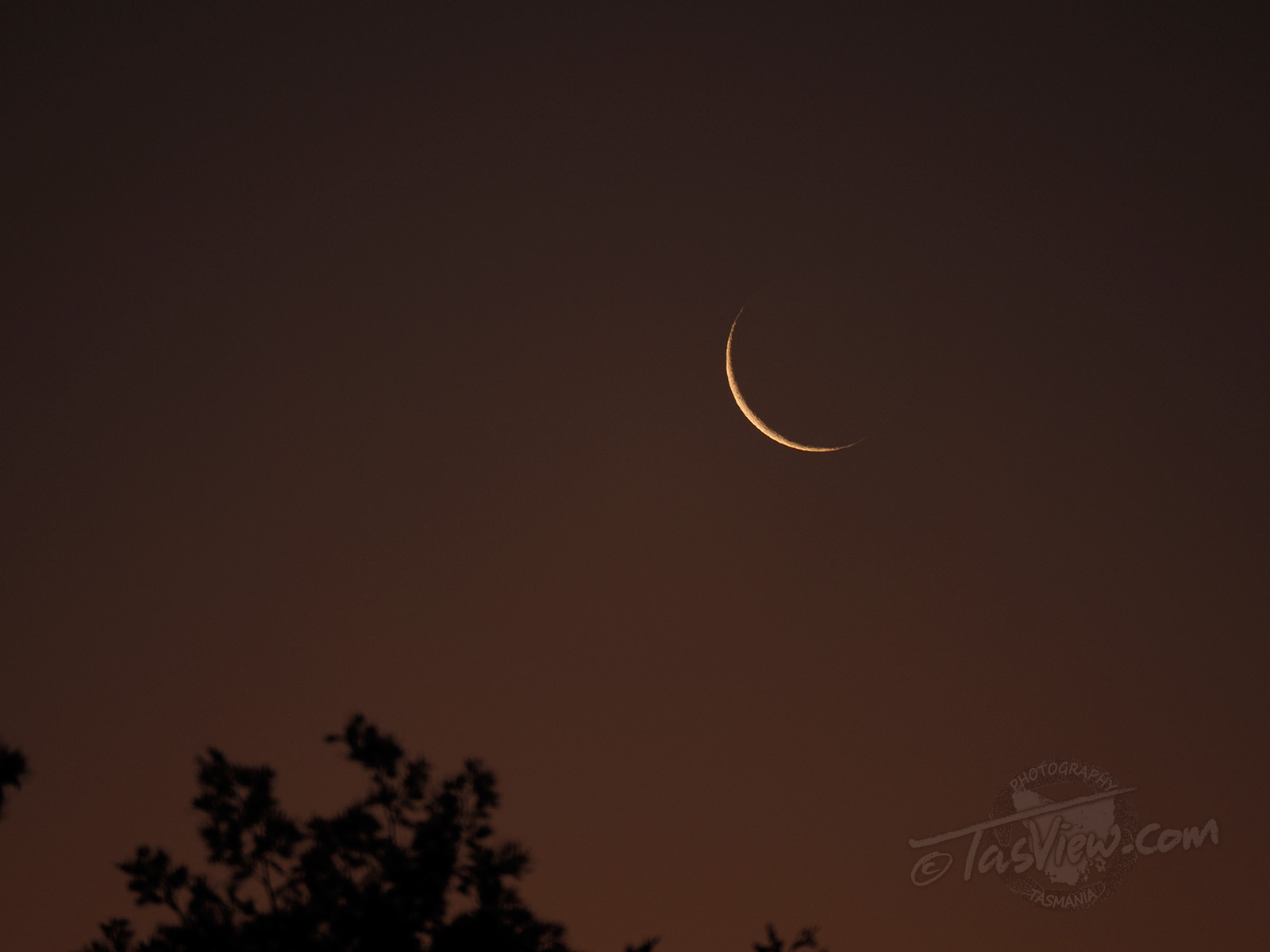 Driving home after work, I was admiring the fading light and last colour from sunset over the mountain, when I noticed a slither of waxing crescent moon hanging in the sky to the west. I immediately found a safe place to pull over on the winding road to home, pulled out the OM-1 with mounted 70-300mm and grabbed a few shots before it slid down behind the tree. This was the best shot.