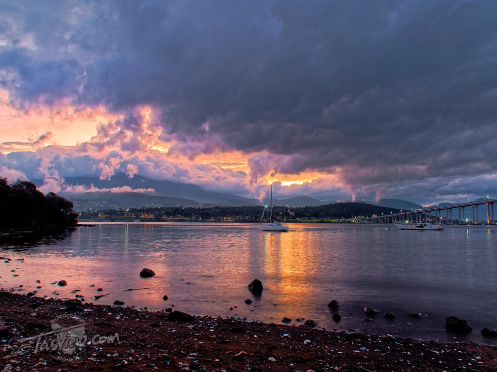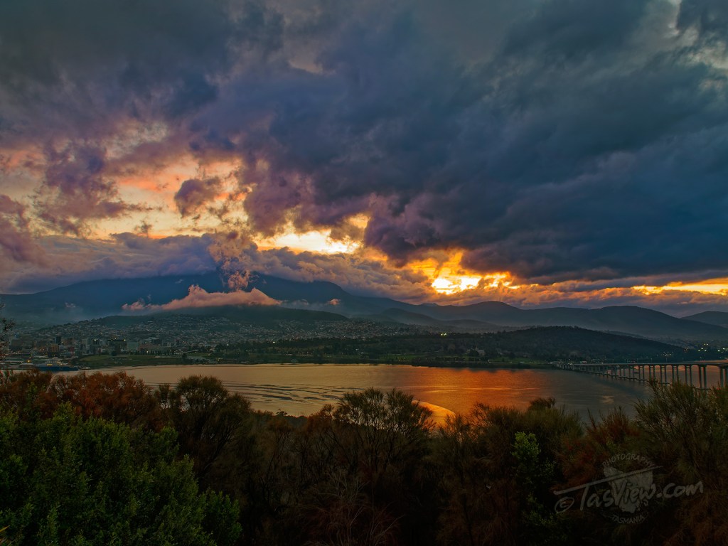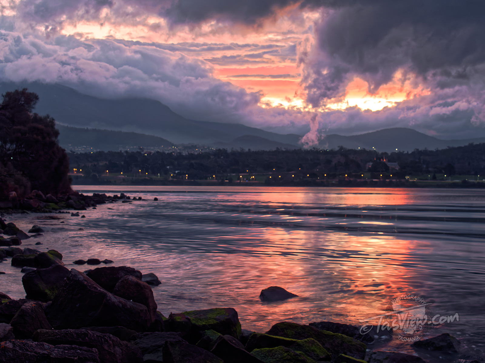 As I climbed into my car after work, I noticed the late low sun skimming the top of some heavy clouds over the mountain. Not a great vantage point, I headed for near by Rosny Hill in a race to catch the light. By the time I got there, the best of that contrasty glow had gone, but colour began to seep through as the light faded.