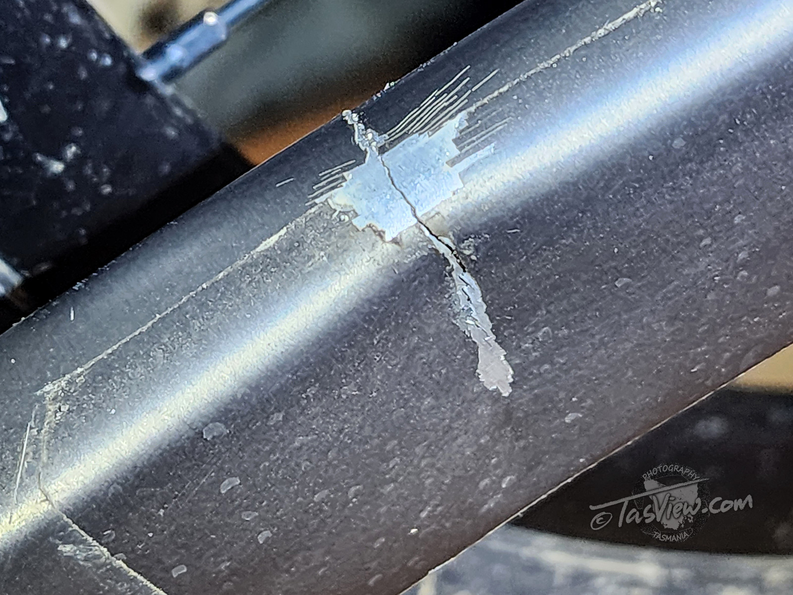 Then it happened. I was washing my bike as usual post ride and noticed a small crack developing that wasn’t there before, radiating from a previous dent in the swing-arm that happened back in April. I pealed the tape off to inspect …