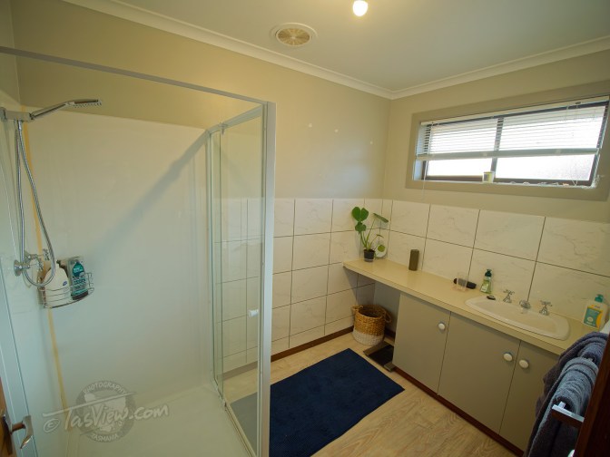 If we walk straight ahead from the image of my room, we end up in the bathroom. Again, it’s modest but more than suits my needs! I would have liked a bath but it’s a mute point being on tank water. As I wrote earlier, an outdoor one down the track will suffice. The cupboards here and in the kitchen are painted, so can be easily changed, again to a contrasting darkish blue. The little Monstera in the corner followed me home from the hardware store, my first indoor plant and I haven’t killed it yet! There will be more 😀