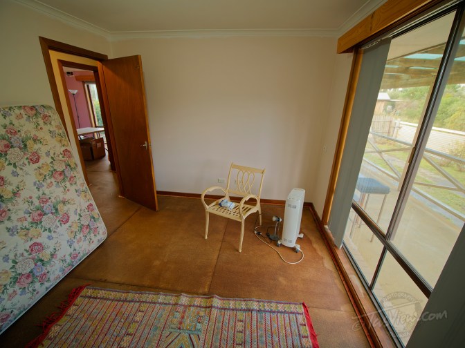 Next is my future bedroom when finished – if I can convince myself to leave the lounge-room. I already have my clothes in the wardrobe. It opens onto the west facing verandah. I will likely have carpet only in the bedrooms, and everywhere else I would like used hardwood flooring.