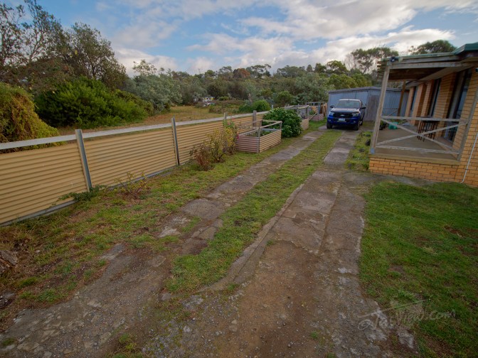 Looking back at the house from the yard corner, I want to put in a greenhouse and wood storage shed behind the blue shed, and probably an outdoor bath/spa somewhere, as I don’t have a bath inside. The roof needs a bit of work too, but it’s not urgent so probably a next summer job. Even just fresh paint elsewhere would tidy the place up. I want heaps of plants in the yard … eventually, probably curvy garden beds and paths, with natives and fruit trees – low maintenance, low water, as I’m now on tanks.