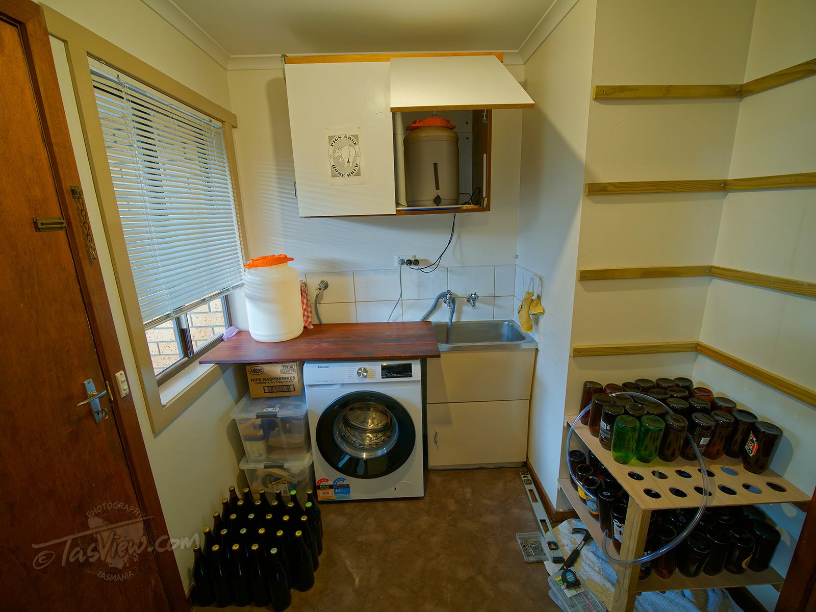 The laundry. It wasn’t a priority, but making beer is, because it will save me money and I love the hobby! Lucky I kept my brew cupboard that holds three fermenters, I knew exactly where it would go when I first walked in! It’s a big laundry just for washing clothes .. I’ve already bottled two brews and another two are bubbling away. Before I could bottle, I needed to make the bench over the washing machine, and because my bottles had been stored in Evan’s shed, they needed to be sterilised, so I needed to build a rack so they could drain (at right). This will become an enclosed cupboard to hold 216 empty and full bottles, 18 cartons with a rotation of at least 3 months (the longer the better) – the project underway in the shed!