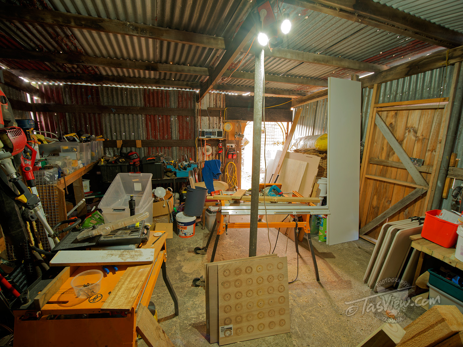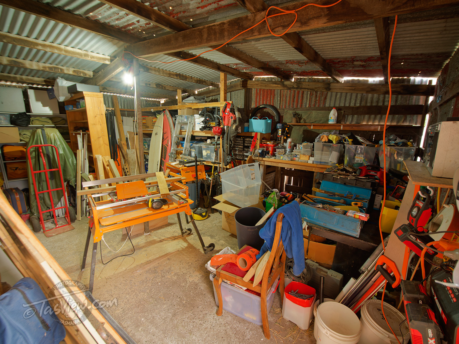 OK, I have a shed! Storage was another top priority for me with my Salamanca market leather business and my workshop tools that I managed to keep (Thanks Evan!!!). I first put all my stock on the shelves to the left below, but soon realised that it was less than ideal. Though dry, there’s no insulation, lots of gaps, and a wire mesh door. Not pleasant for me replacing stock in winter. Spare stock has been moved to Betty’s room and only my protected market stock is stored in the shed.