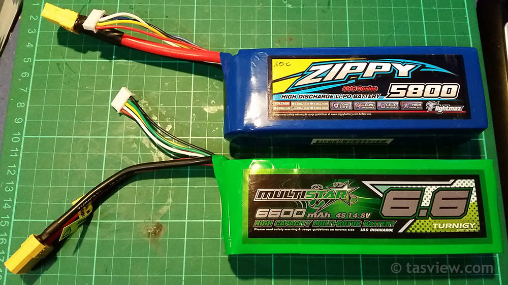 They preform very similar with around 14 mins safe flight time, the 6600 having the slight edge, is cheaper and has the XT90 connector I’m using pre-installed. Both are available from Hobby King.